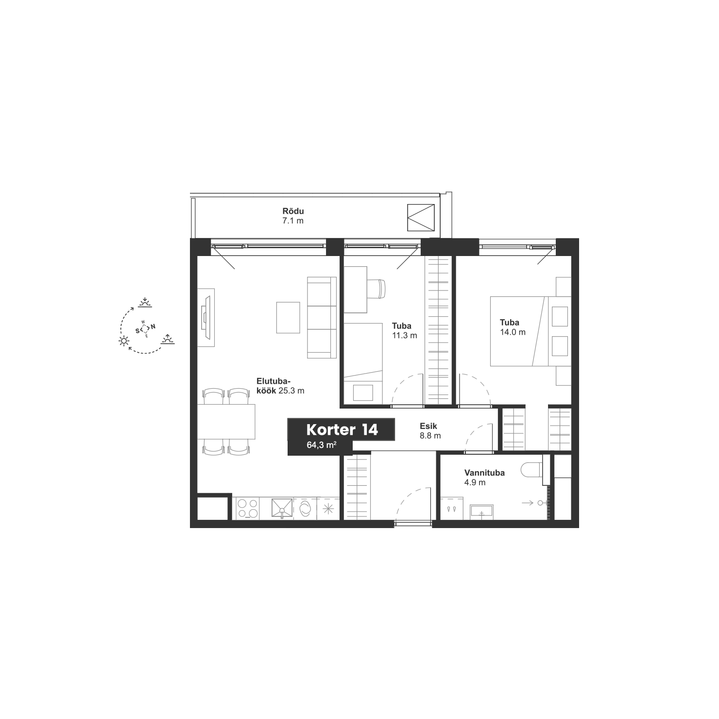 3 korrus 3 tuba 64.3 m2 Rõdu 7.1 m2