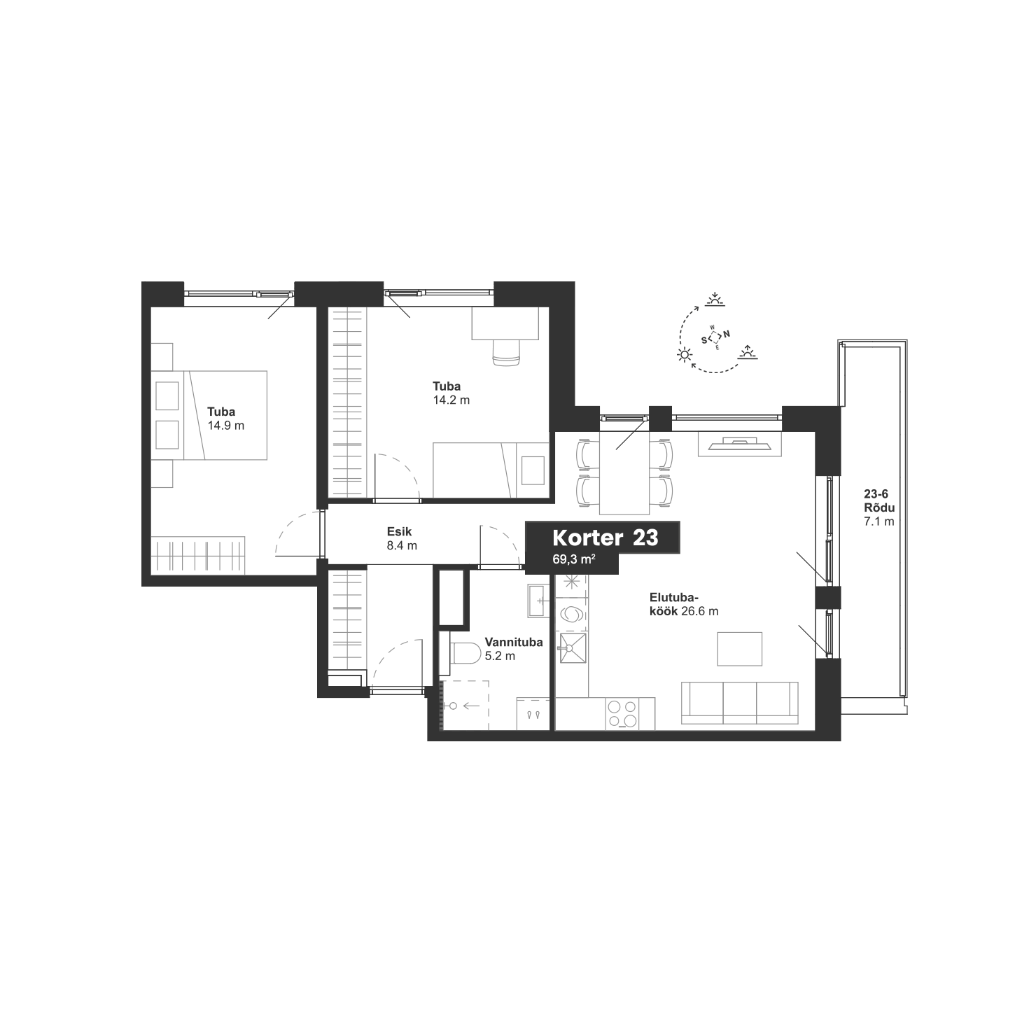 4 korrus 3 tuba 69.3 m2 Rõdu 7.1 m2