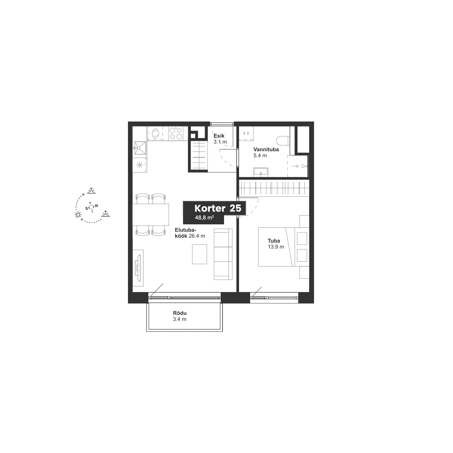 4 korrus 2 tuba 48.4 m2 Rõdu 3.4 m2