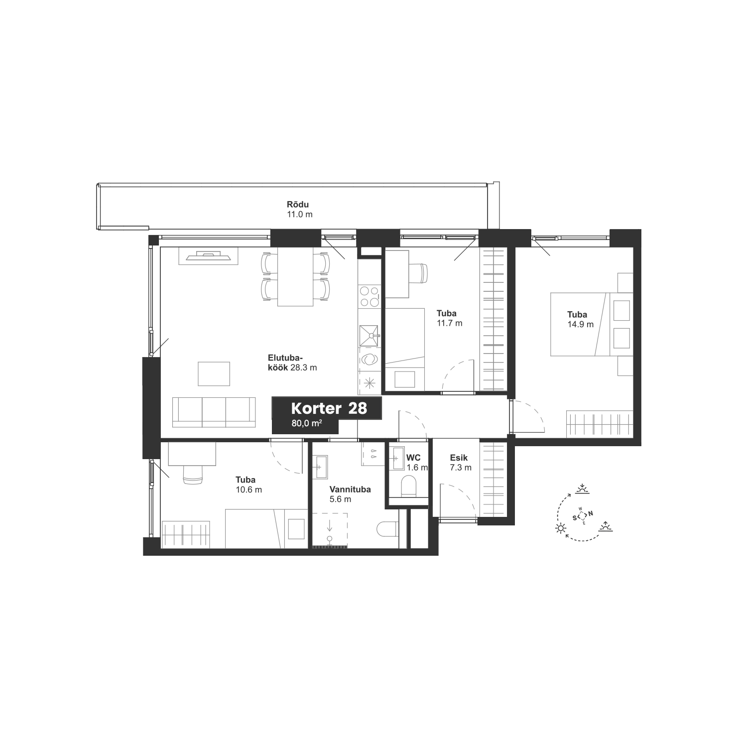 5 korrus 4 tuba 80 m2 Rõdu 11 m2